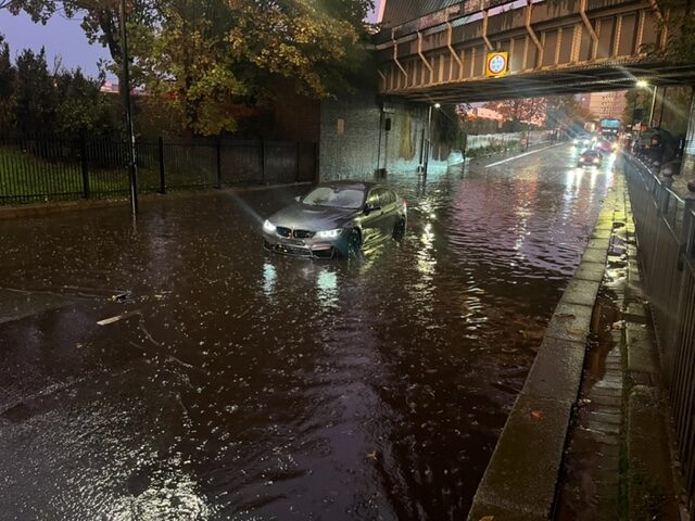 Torrential rain over the past 48 hours has seen a road in North Acton become inaccessible to vehicles. Cars and buses as well as emergency services have had to turn around by the bridge in Victoria Road and at least one was trapped after they attempted to cross the flooded road.