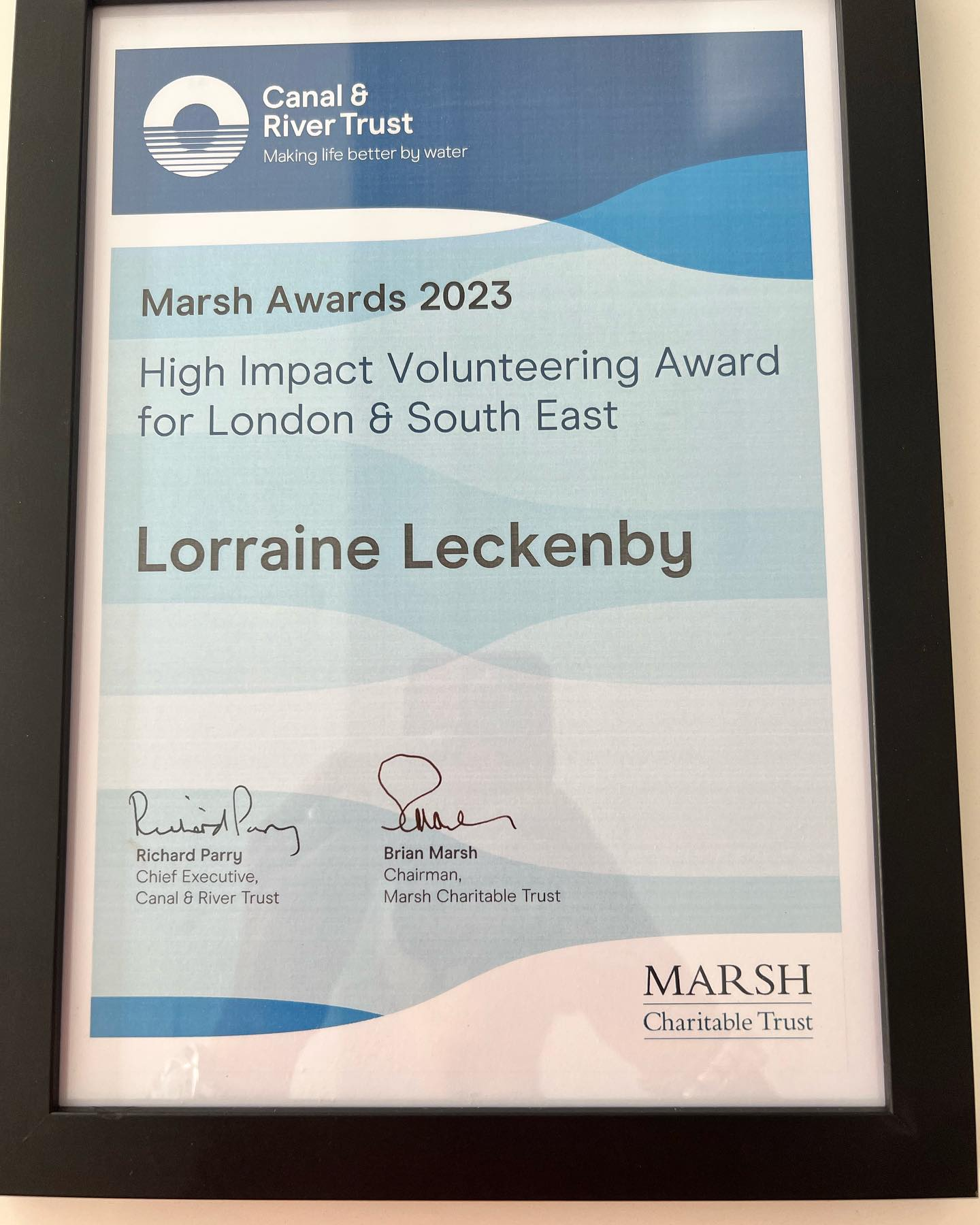An Ealing volunteer with the Canal and River Trust has been recognised for her dedication to the Grand Union Canal in Alperton by getting a Marsh Awards “High Impact Volunteering Award”.