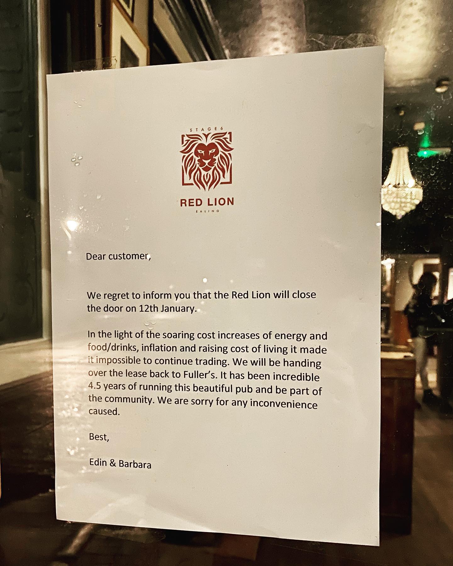 In a notice posted by the couple on the pub’s door, they say of the closing on 12 January 2023: “In the light of the soaring cost increases of energy and food/drinks, inflation and raising [sic] cost of living it made it impossible to continue trading. We will be handing over the lease back to Fuller’s. It has been an incredible 4.5 years of running this beautiful pub and be part of the community. We are sorry for any inconvenience caused.”