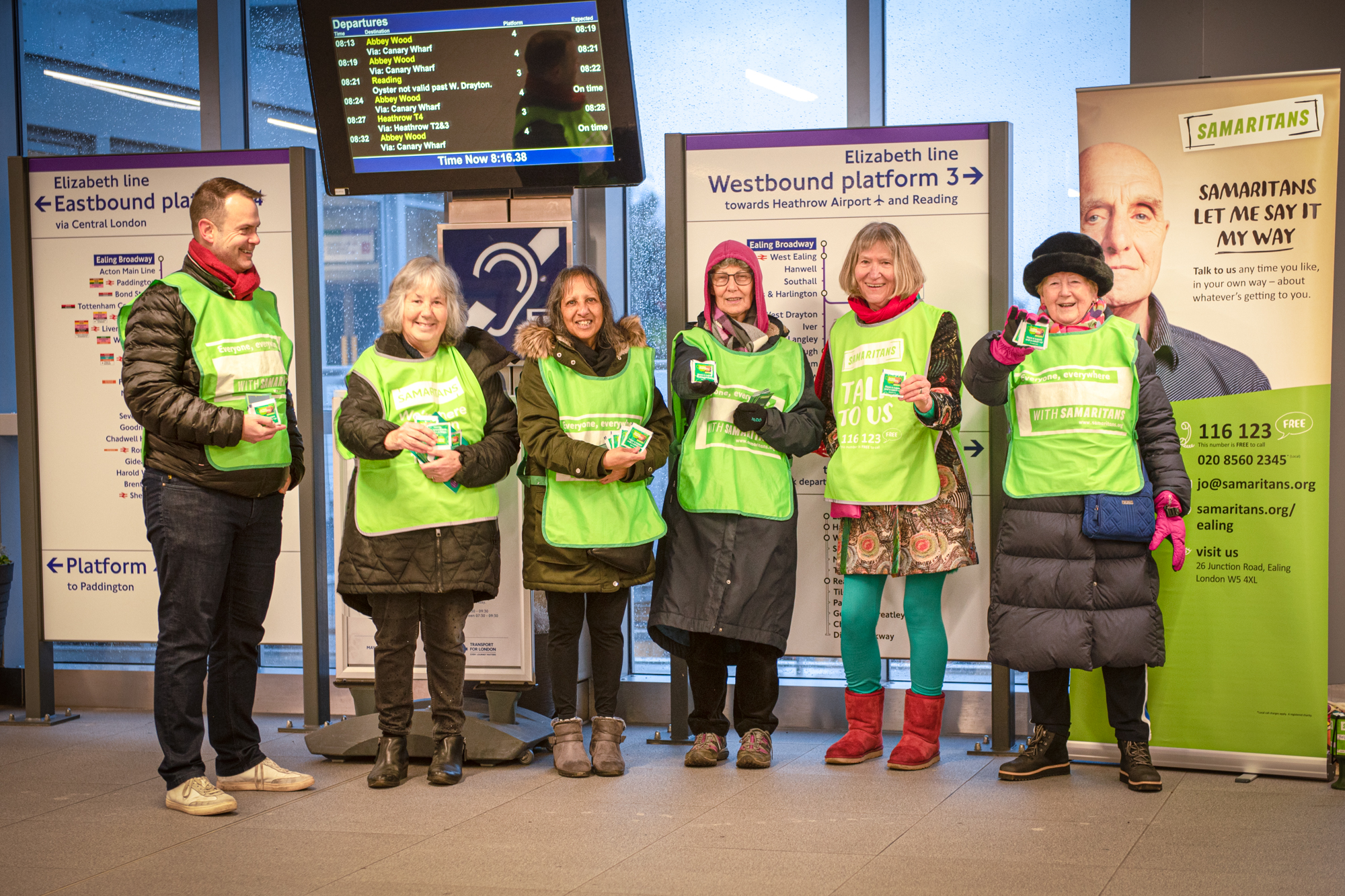 A team of volunteers from the Ealing, Hammersmith & Hounslow branch of Samaritans were out in force this morning (16 January 2022) with tea bags at Ealing Broadway station to help commuters and travellers cope with Blue Monday.