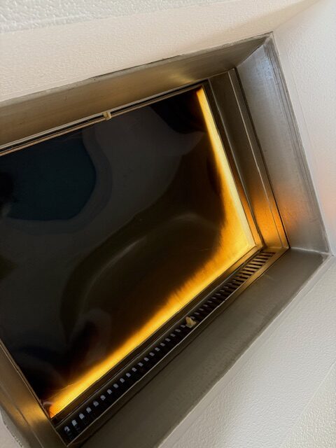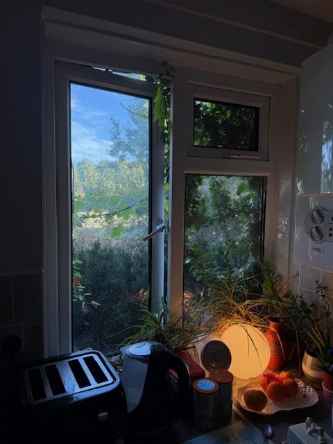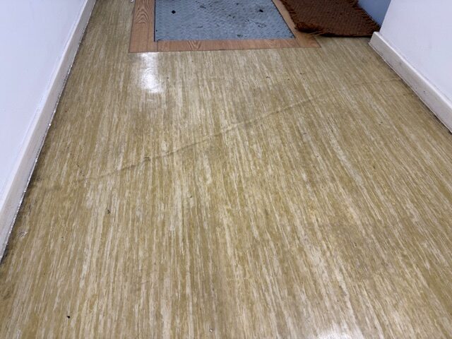 Inside, communal areas reflect what residents describe as decades of neglect: windows that won’t close, skylights on the second floor ingrained with dirt and no longer letting in light, and lino flooring which they say is the original laid more than 40 years ago. Ceilings in shared spaces bear water stains from leaks, asbestos warning stickers are visible, and metal service hatches sit exposed in hallways, poorly maintained and uncovered by any lino. Residents say they have received no update from Peabody on how the asbestos risk or other hazards will be dealt with.