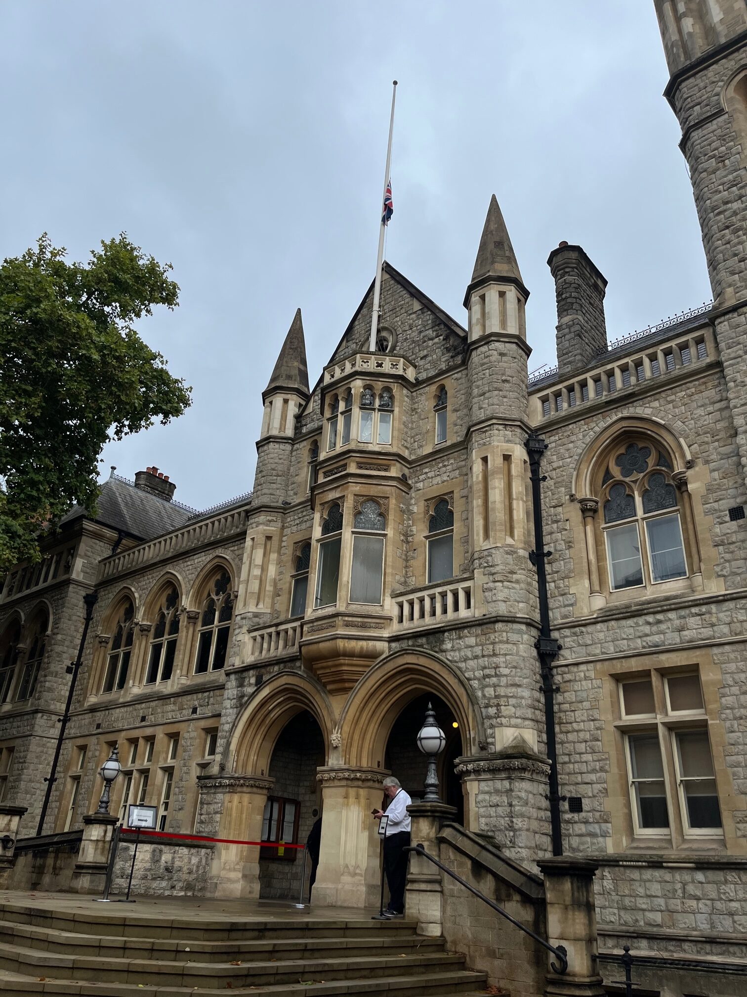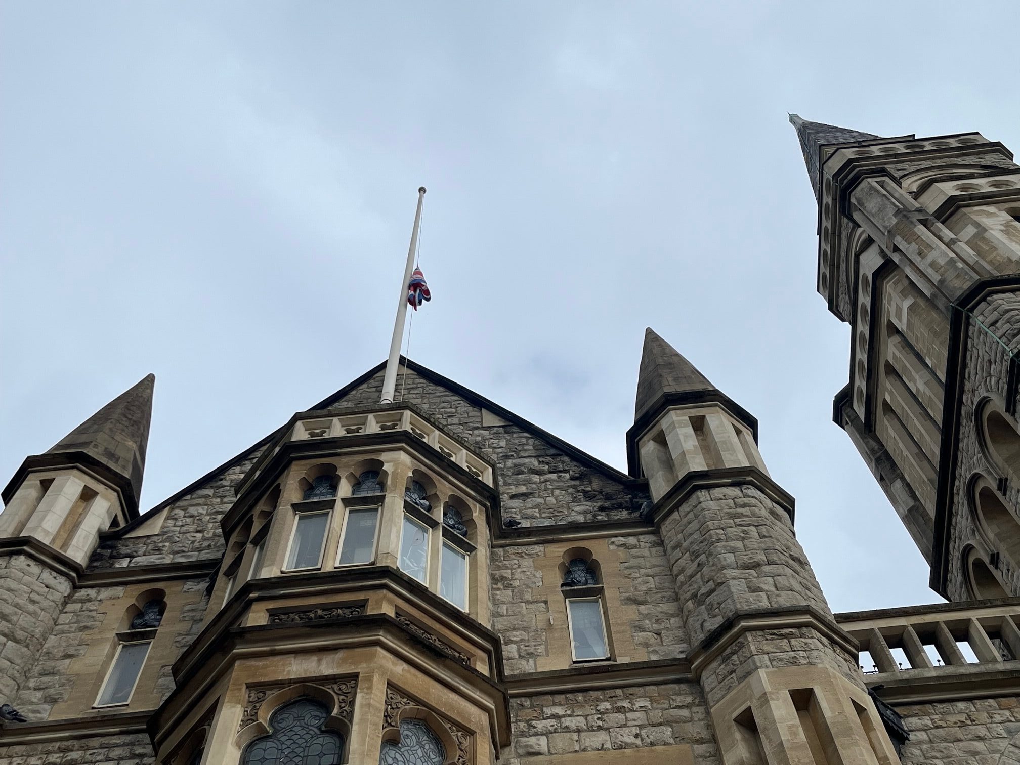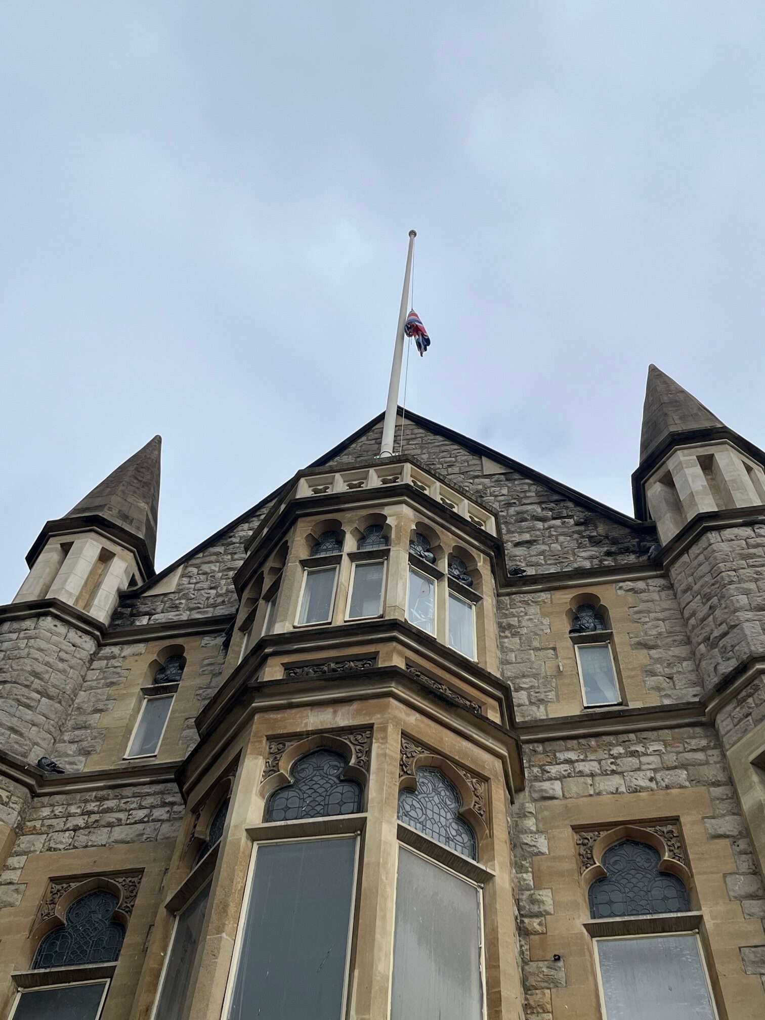Above the Town Hall, the British flag is half mast in respect to The Queen.