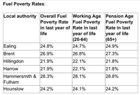 Fuel poverty shows a similar pattern. Ealing recorded a fuel poverty rate of 24.8% among all people over the age of 20 in their last year of life. This includes 24.7% of working age residents and 24.9% of pension age residents. Brent recorded higher levels overall at 26.9%, including 26.8% for working age people and 27.3% for those aged 65 and over. Hillingdon and Harrow both reported overall fuel poverty rates of 21.9%. In each borough, 22.1% of working age residents and 21.8% of pension age residents were affected.