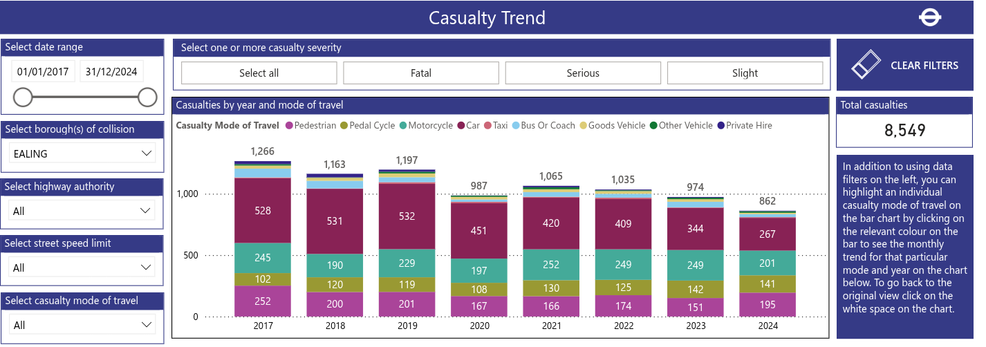Ealing has recorded a 32% drop in overall road casualties since 2017, falling from a peak of 1,266 to 862 in 2024. However, the most recent data from Transport for London (TfL) reveals a rise in injuries to pedestrians and pedal cyclists in the borough last year.