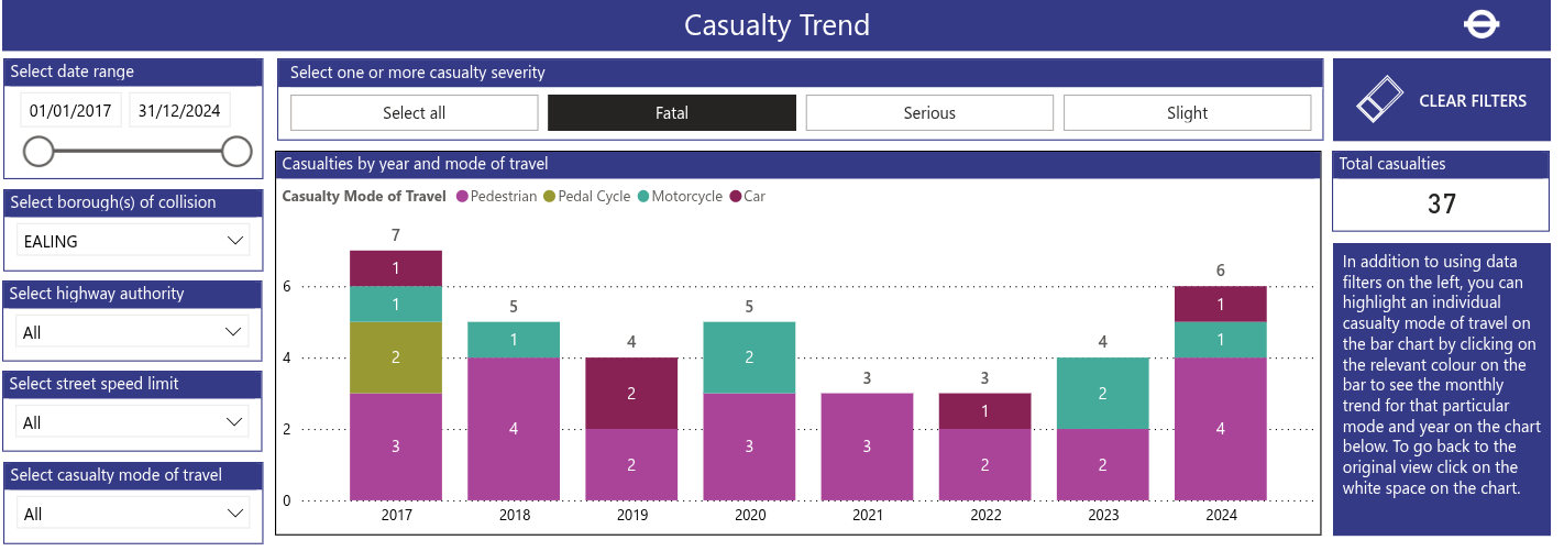 Pedestrians continue to be disproportionately affected: in 2024, four of the six fatalities were pedestrians — double the number seen in each of the previous two years. TfL’s data also shows that no cyclist fatalities have occurred in Ealing since 2017, when two were recorded.