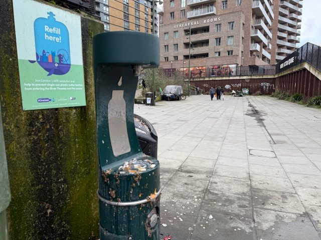 One local told EALING.NEWS: “It really is appalling to see the state of this new entrance and public square.  Who is going to risk their health by refilling water with a fountain that is never kept clean? Why is no-one doing anything to secure the handrails which are dangerous and why is it allowed to be run down and look like this?”