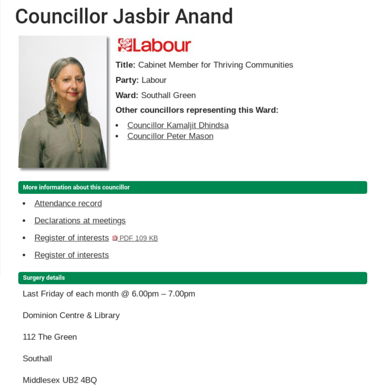 For many years and before Covid, Southall resident Angela Fonso and her neighbours have been trying to see their Southall Green Councillors for ward surgeries. But despite the need of residents wishing to have and use surgeries, the Councillors including the now leader of Ealing Council, Peter Mason have ignored their requests and continue to make it difficult to meet.