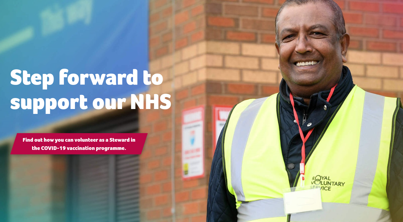 Steward volunteers support NHS staff at vaccination sites with non-clinical tasks, including safe movement of patients through the process and identifying people who require additional support.