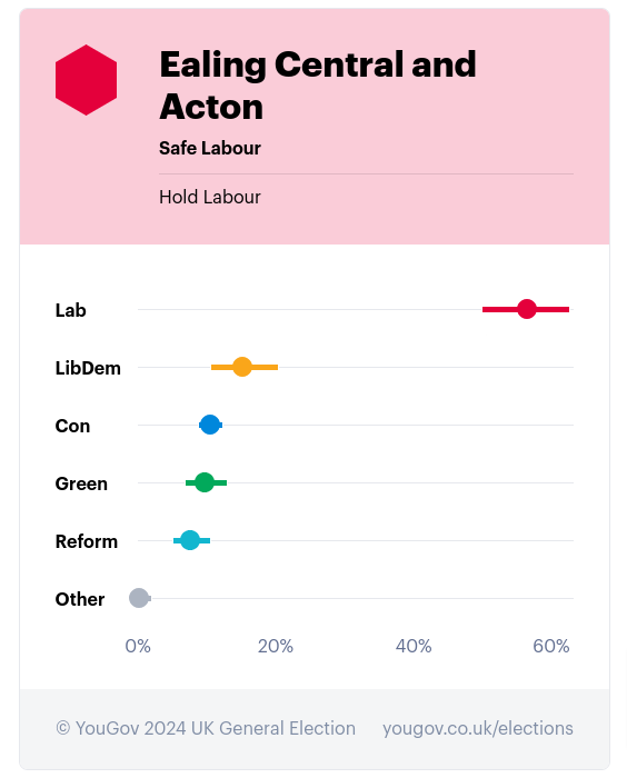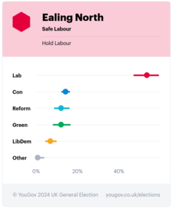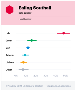 A new YouGov 2024 General Election poll has found voting intention for Labour in each of the three constituencies of Ealing has dropped in two weeks with Ealing Southall falling by 20%.